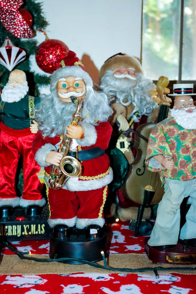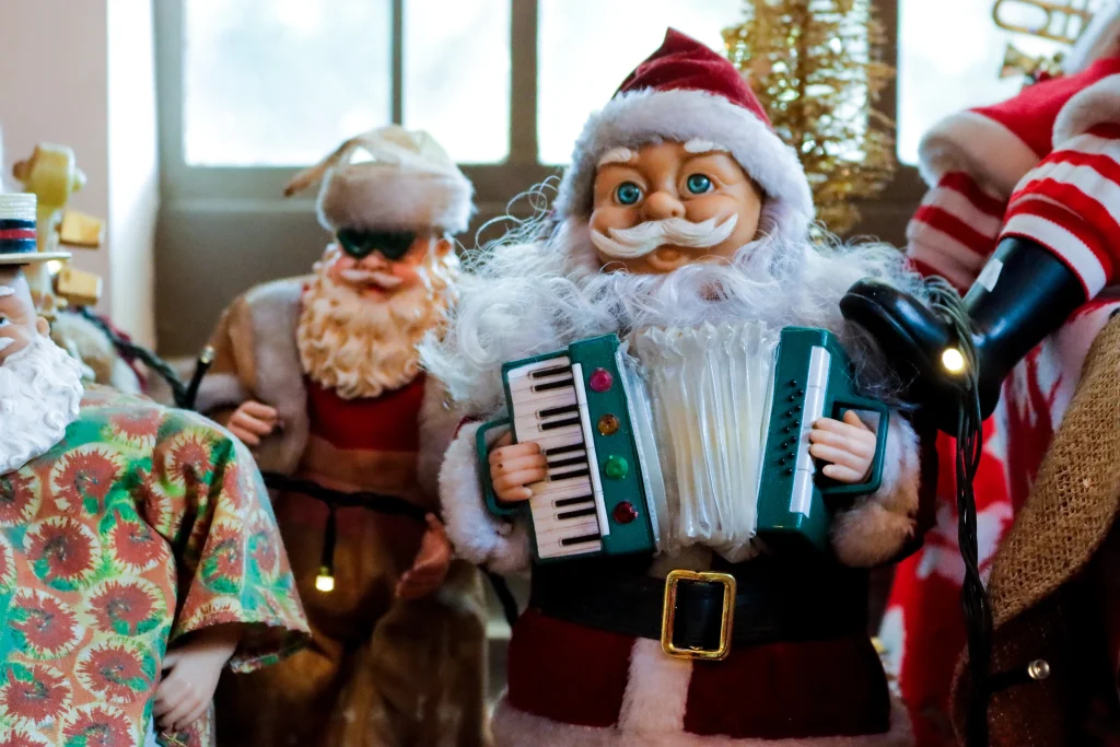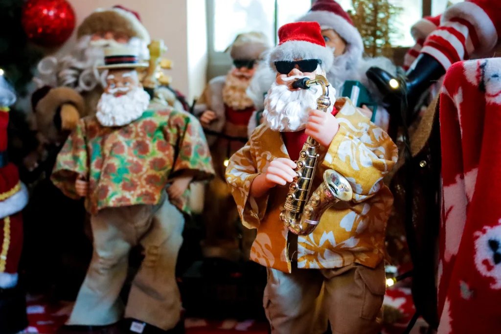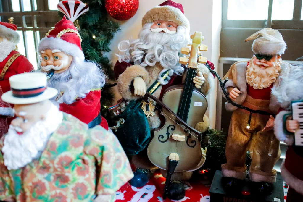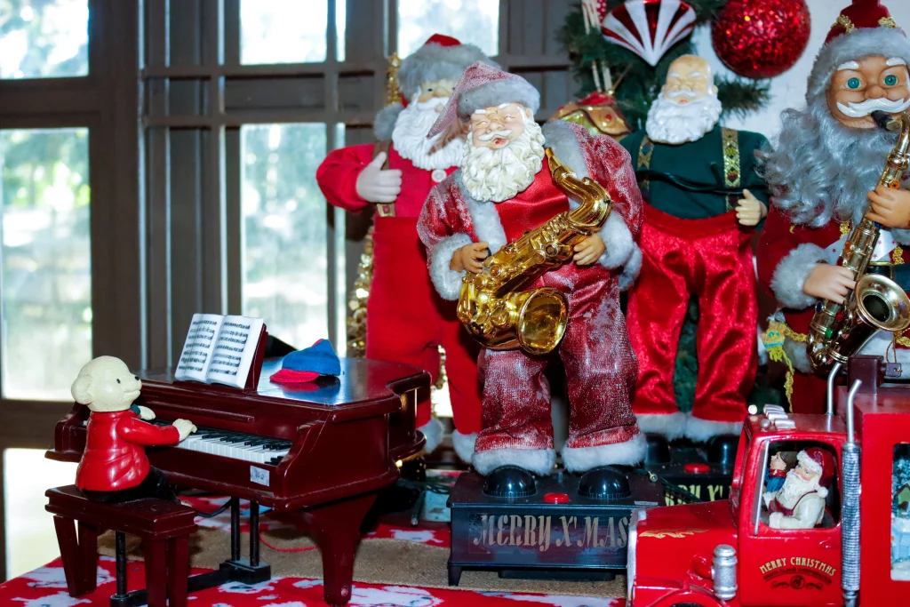 A collection of Santa Figures holding a variety of musical instruments