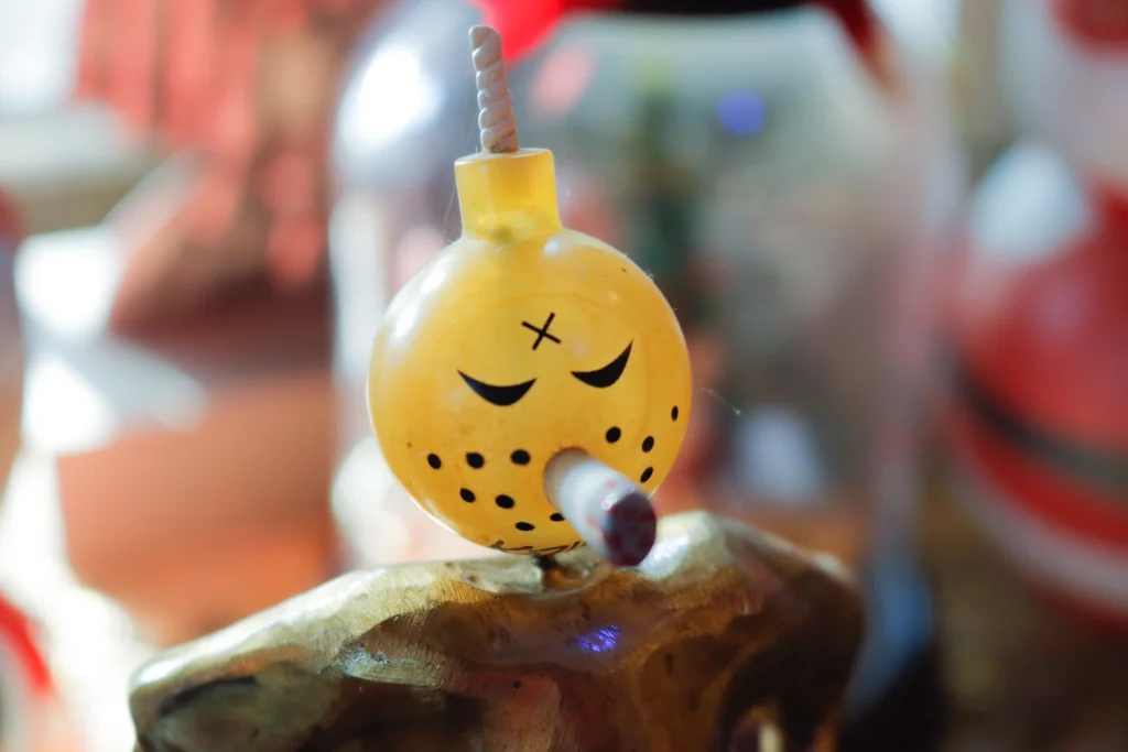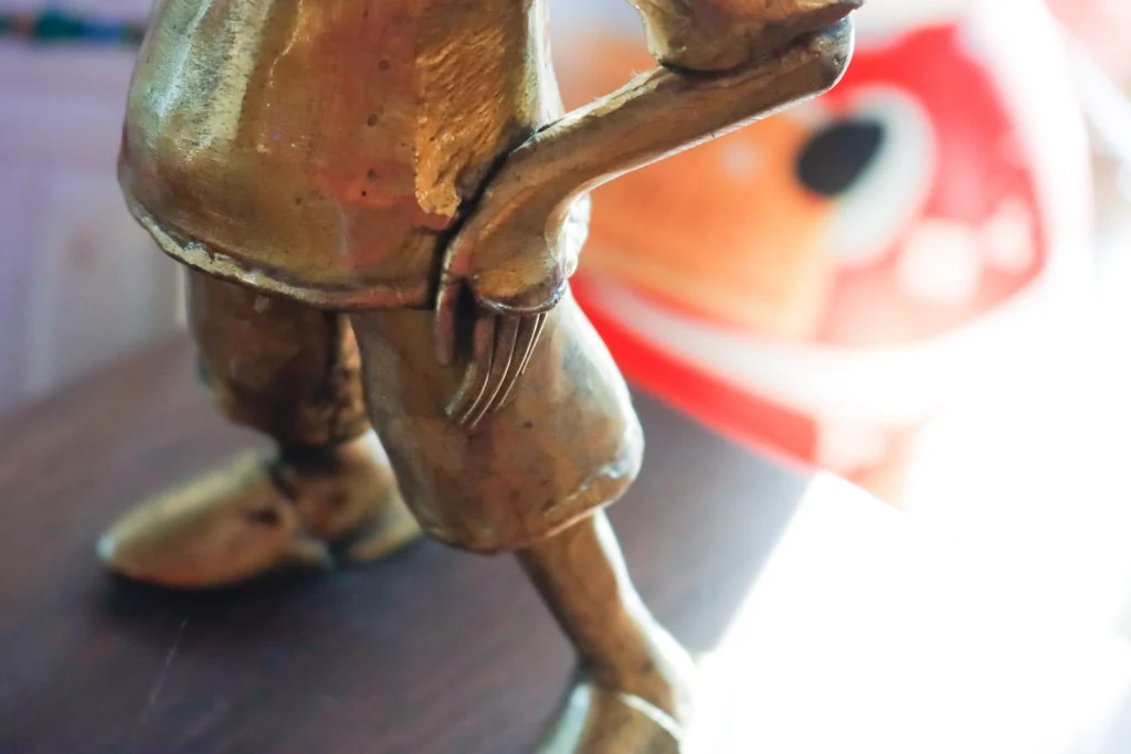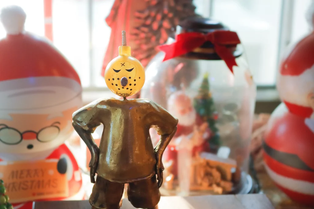 Michael Cacnio’s interpretation using The Bomb (toy collectible) as head and mounting it in a sculptured brass body of Santa. Horse rider handpainted from a small town in Russia.